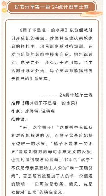 4月10日-4月23日,yl23411集团“润心沐阳”二级心理辅导站开展“好书鉴语,墨香漫谈”—世界读书日之分享一本好书活动。24统计班单士霖推荐《橘子不是唯一的水果》,以“橘子”隐喻打破单一价值观的勇气,探讨成长中对自我的追寻;熊子豪分享李娟的《我的阿勒泰》,用诗性文字展现西北边疆的旷野牧歌与牧民在物质匮乏中的精神坚守;李伊蕊解读余华的《活着》,通过主人公福贵的一生,感悟“活着本身就是意义”的生命哲学。活动期间,同学们通过文字交流读书心得,在书籍中寻找心灵共鸣,让一本本佳作成为照亮成长道路的灯塔,在阅读中遇见更辽阔的精神世界。