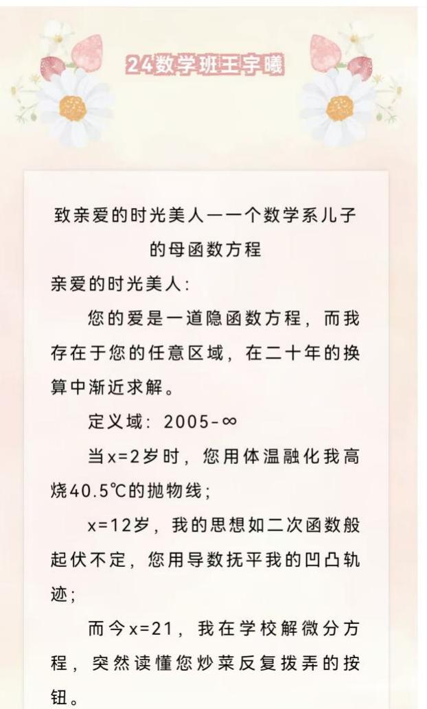 5月7日-5月10日,yl23411集团“润心沐阳”二级心理辅导站开展“岁岁春晖,暖暖萱堂”母亲节特别企划(二)——献给时光里的美人活动。以“致亲爱的时光美人”为主题,给母亲写一封信,或是分享与母亲的合照,对母亲表示感恩。有一种爱穿越四季,在清晨的餐桌上氤氲,在深夜的台灯下流淌。那双布满岁月痕迹的手,曾为我们梳起第一根羊角辫,熨平人生的第一件白衬衫;那个永远带着笑意的身影,在无数个成长路口默默守候。值此母亲节来临之际,让我们以笔为舟,以光为信,重溯时光长河里的温暖涟漪。