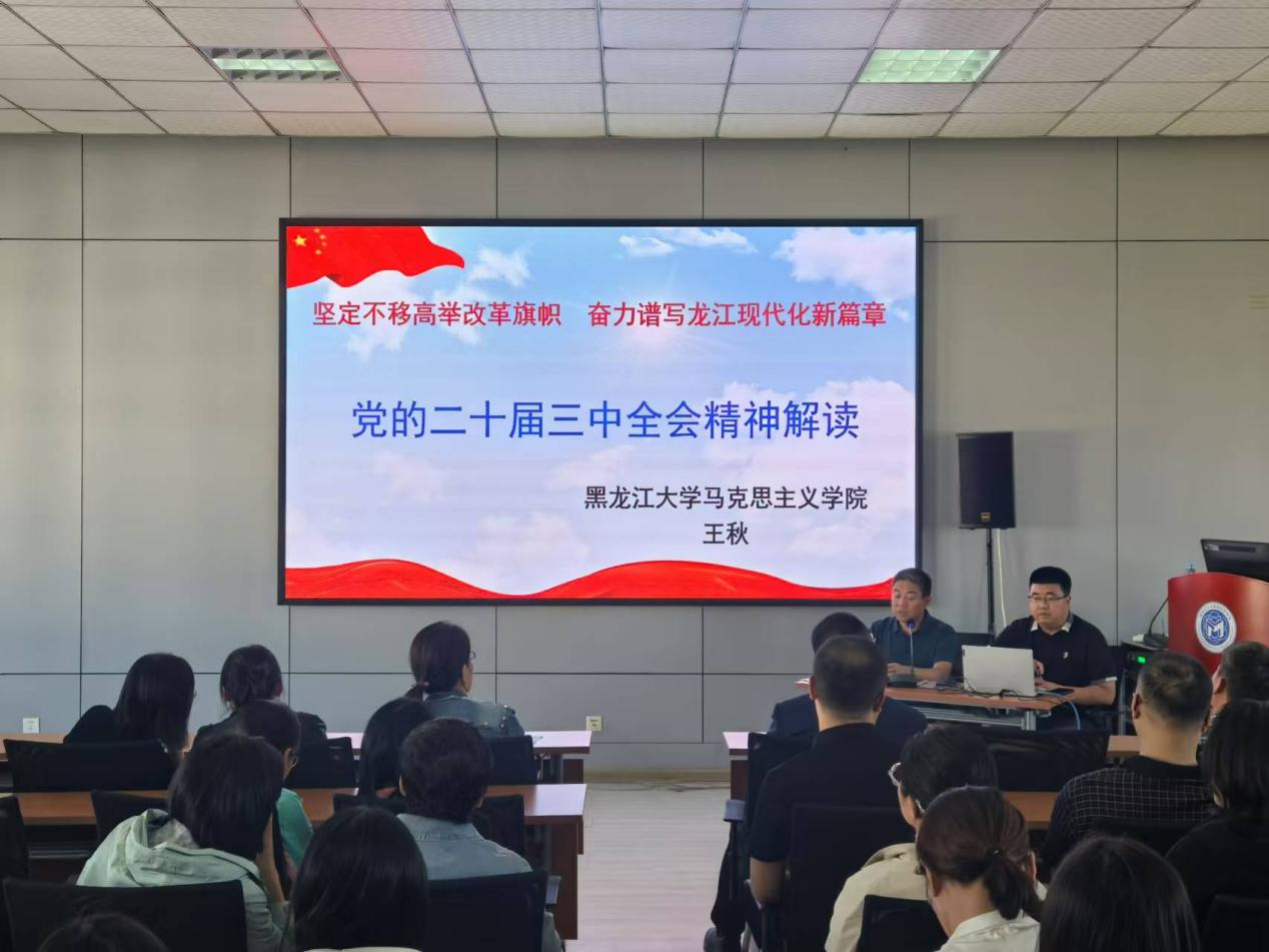 为深刻领会党的二十届三中全会精神和省委十三届六次全会精神,按照学校《中共永利官网委员会关于学习宣传贯彻党的二十届三中全会精神的通知》和《中共永利官网委员会关于做好省委十三届六次全会精神学习宣传贯彻的通知》相关要求,9月18日下午,yl23411集团开展学习贯彻党的二十届三中全会精神宣讲会。学校专家宣讲团成员、马克思主义学院院长王秋教授以《坚定不移高举改革开放旗帜 奋力谱写龙江现代化新篇章》为题做主题宣讲,全院教工党员、民主党派、无党派知识分子,及学生党员代表共计100余人参加本次宣讲,学院党委书记张龙主持会议。