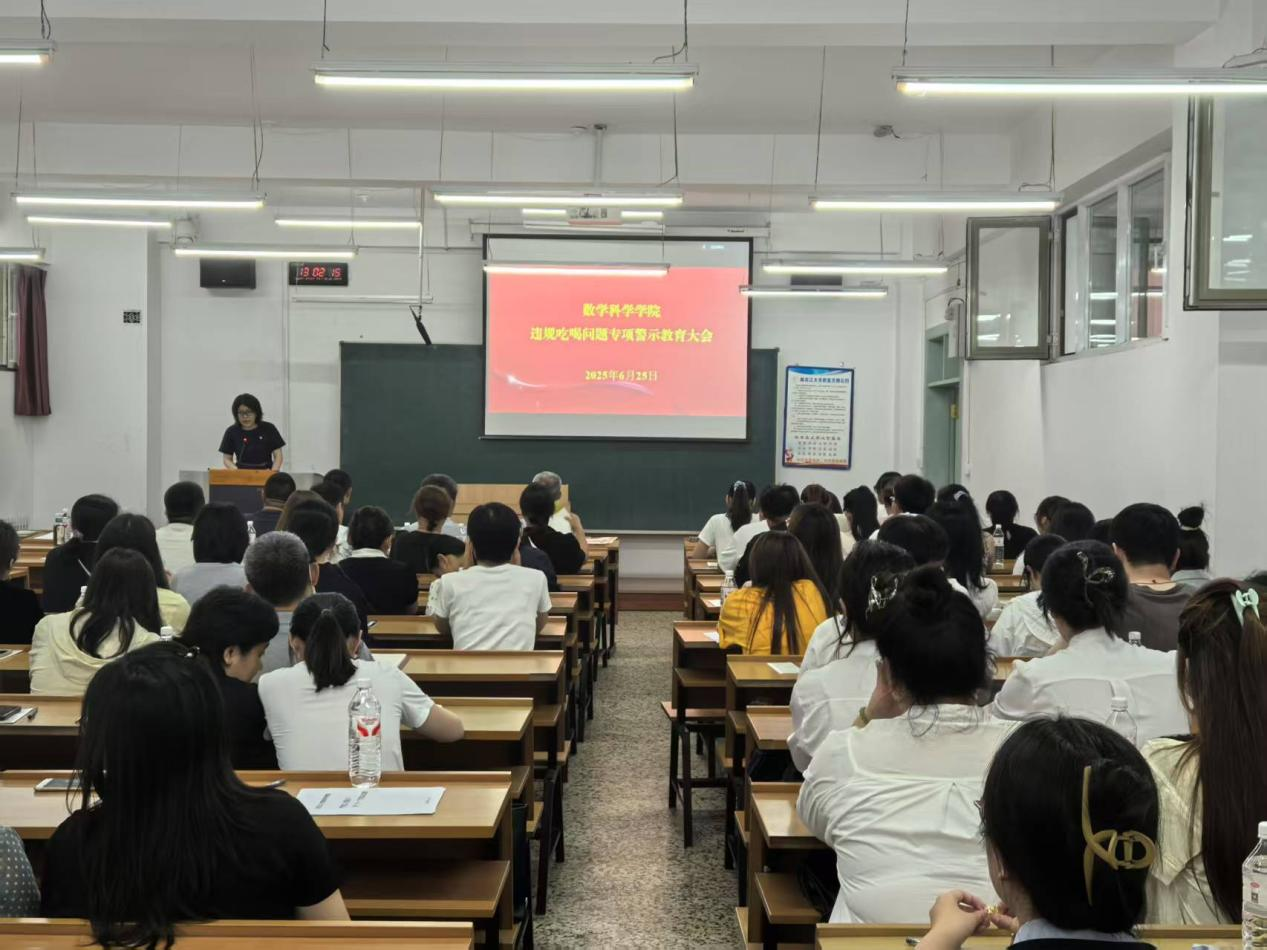 为深入贯彻落实全面从严治党要求,进一步严明纪律规矩,营造风清气正的政治生态和育人环境,6月25日,yl23411集团在3号楼115教室召开违规吃喝问题专项警示教育大会。会议由学院党委副书记徐静波主持,学院领导班子全体成员、全体教师党员以及学生党员参加会议。