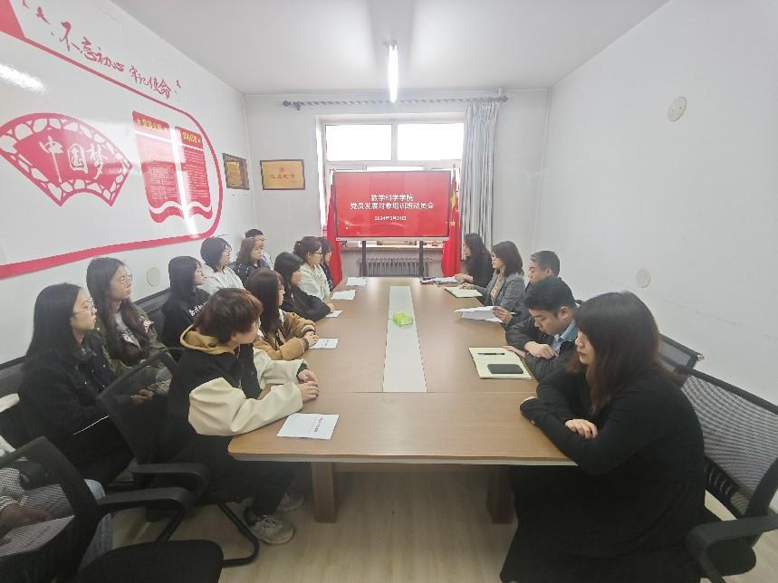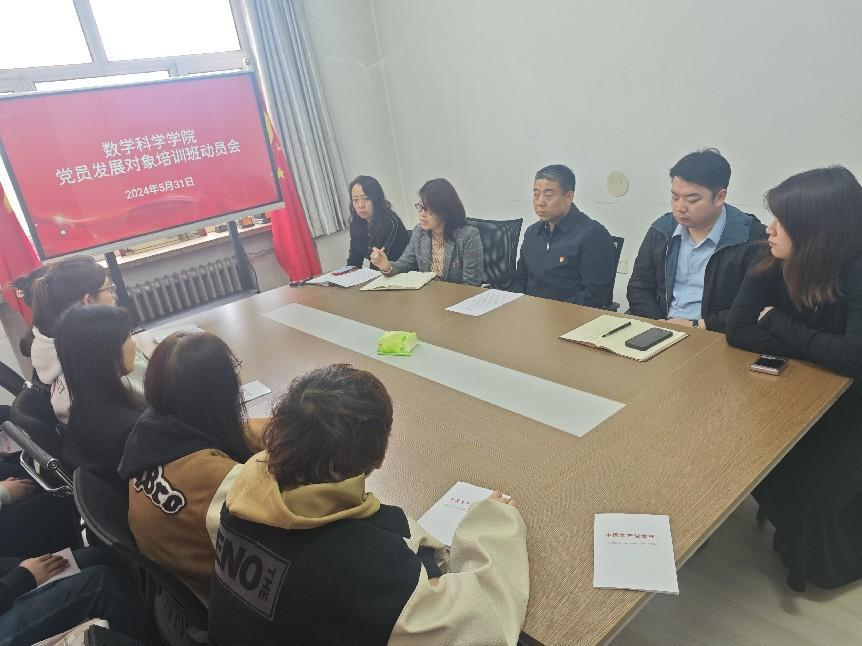 按照校党委组织部关于举办永利官网第六十九期党员发展对象培训班暨党纪学习教育专题培训班的通知要求,为深入学习贯彻习近平新时代中国特色社会主义思想和党的二十大精神,进一步提高党员发展对象政治素质,加强党员队伍后备力量,数学科学学院党委于2024年5月31日举办第六十九期党员发展对象培训班暨党纪学习教育专题培训班动员会,学院党委书记张龙、党委副书记徐静波、副处级组织员钱海霞、学生党支部书记张卓豪、徐远航和第六十九期党员发展对象培训班全体学员参加动员会。会议由副处级组织员钱海霞老师主持。