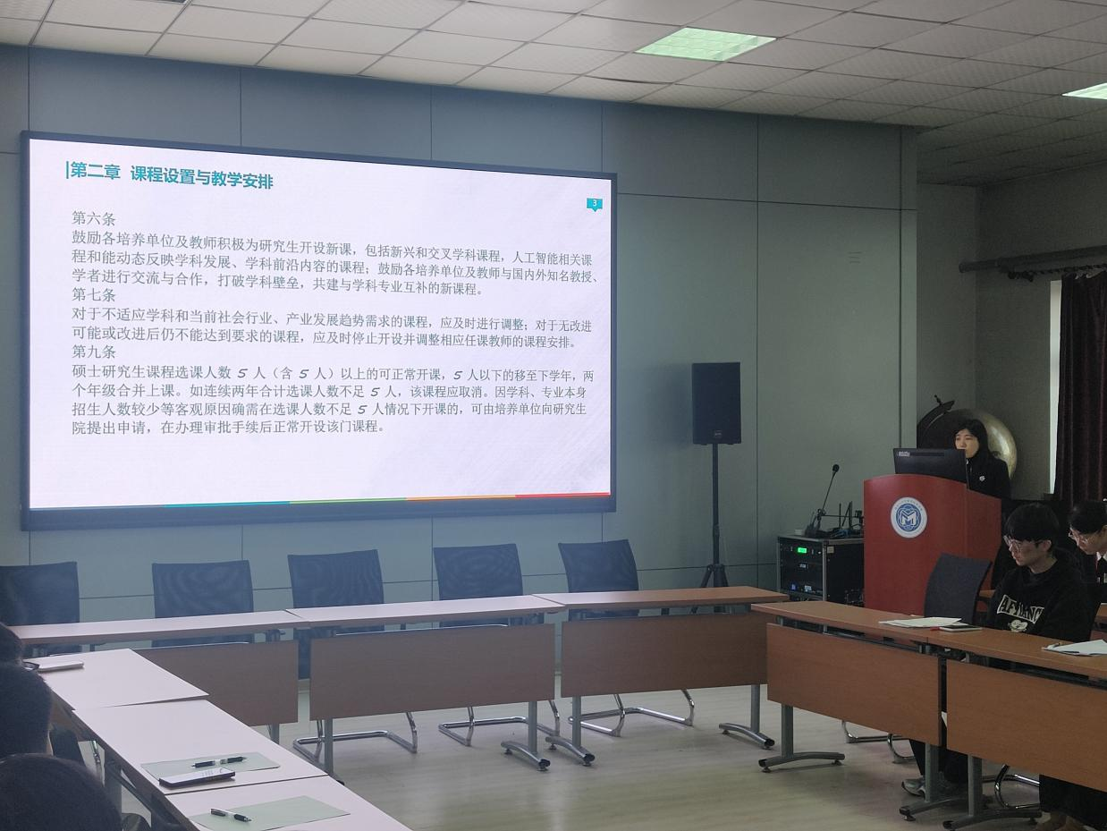 路璐对“研究生教师授课教学方案”进行了详细阐述,内容涵盖课程设置与教学安排的科学规划、教师管理的规范要求、课程考核的多元模式,以及教学检查与质量保障体系的建立,系统梳理了研究生培养的教学实施全过程。
