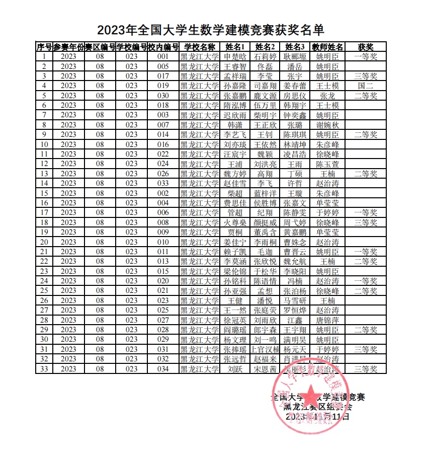在2023年9月进行的高教社杯全国大学生数学建模竞赛中,永利官网共有33个队伍成功参赛。经省赛区组委会和全国组委会评审,永利官网最终获得国家级二等奖1项,省级一等奖4项,省级二等奖6项,省级三等奖4项,合计15项,获奖比例在省内位居前列。