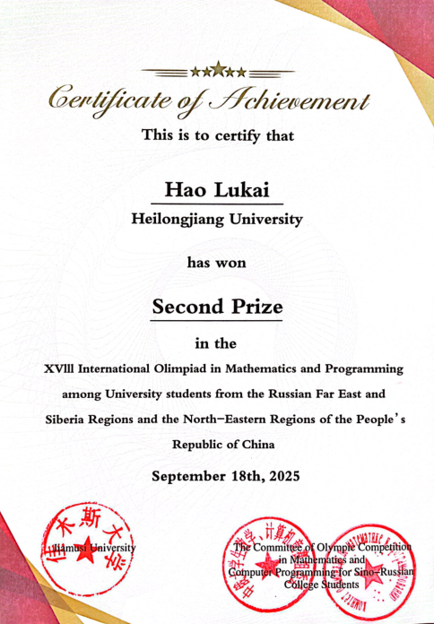 第十八届中国黑龙江与俄罗斯远东地区大学生数学、计算机竞赛于2025年9月18日在佳木斯大学举行,由黑龙江省和俄罗斯远东地区两个国家的10余所高校的学生参加比赛。经过学校数学竞赛组委会的精心筛选,今年我校参加数学竞赛的有王筠可、唐志强和郝璐凯3名学生,由王士模老师带队参加比赛。这次竞赛中参赛学生经过努力取得了优异的成绩,3名参赛学生全部获奖。在这里向在这次竞赛中获奖的学生表示祝贺。现公布本次数学竞赛获奖名单如下: