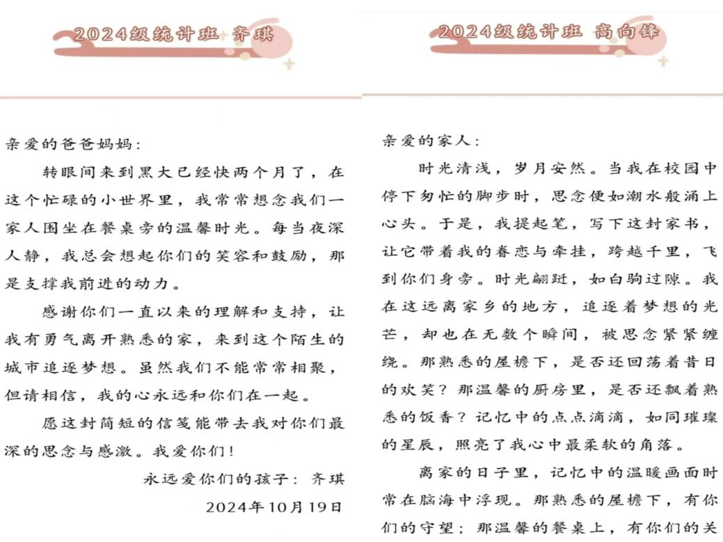 2024 年 10 月 19 日至 2024 年 10 月 23 日,yl23411集团润心沐阳二级心理辅导站开展 “一纸书信,千里传情”—— 一封家书征集活动。活动旨在增进学生与家人间的情感沟通,弘扬中华传统书信文化。学院学生纷纷参与,将对家人的思念、感恩与爱倾诉在字里行间,一封封家书如同一座座桥梁,连接着同学与家人,传递着爱意,让我们体会到亲情的珍贵。