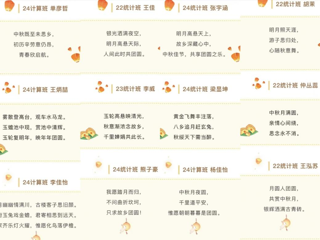 2024 年 9 月 13 日至 2024 年 9 月 16 日,yl23411集团润心沐阳二级心理辅导站开展 “月满诗笺,心映清辉”—— 中秋主题三行诗活动。以笔为媒,以月寄情,让同学们通过创作三行诗表达对中秋佳节的感悟和对亲人的思念。同学们积极参与,创作出了一首首动人的诗篇,这些三行诗或简洁明快或深情婉约,承载着同学们的别样感悟和无尽思念,如同一根无形的丝线,牵动着身在异乡学子的心,表达了浓浓的思乡之情。