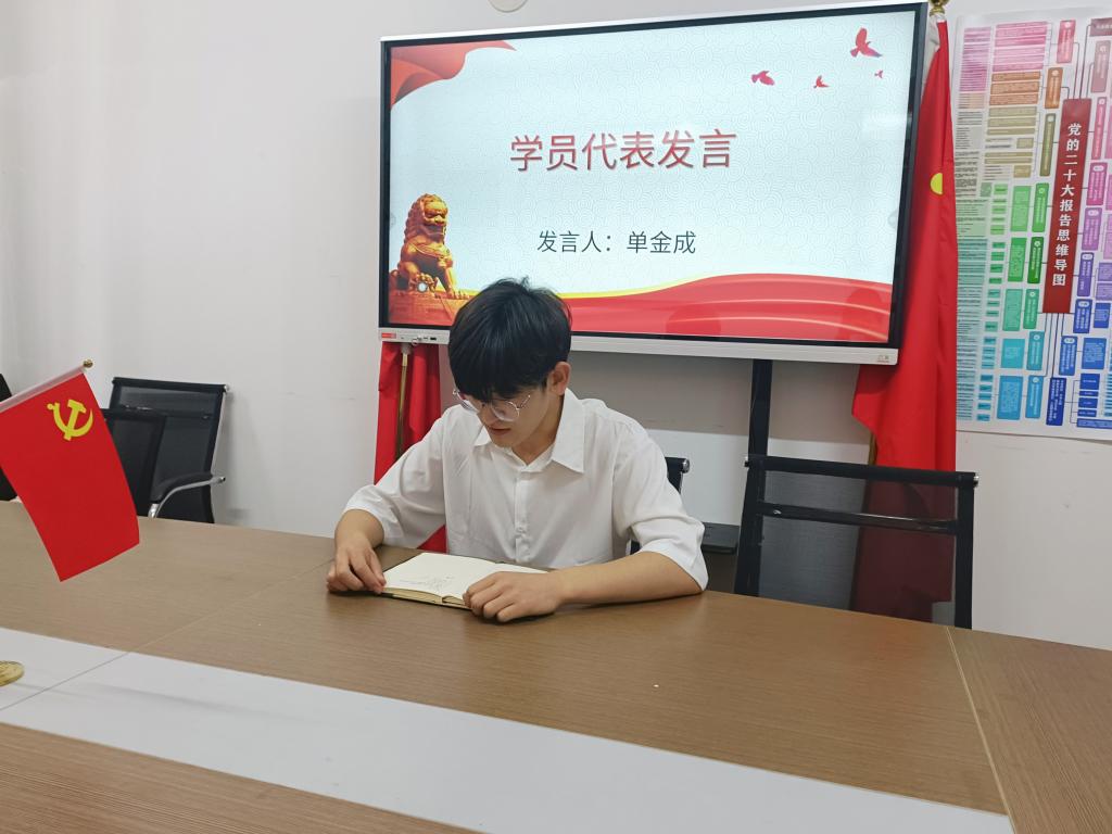 接着,学员代表单金成发言,他首先代表参加培训的学员感谢学院党委组织开展学习的机会,号召学员们端正入党动机,坚定理想信念,利用好学习资源,提升政治意识和思想素养。在校期间努力学习专业知识,关注关心国家大事,爱党、爱国、爱校,用实际行动努力提高自身能力,用思想指导实践,为社会多做贡献。他说,作为一名新时代的大学生,深知幸福生活来之不易,一定不辜负老师和家长的期望,一步一个脚印踏踏实实地学习,多掌握本领,担起责任,实现个人价值,回报母校。