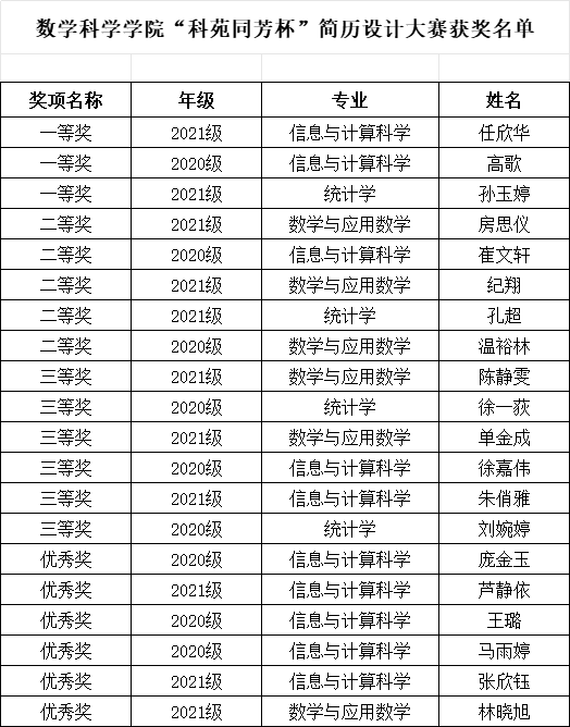 为贯彻落实党中央、国务院关于促进高校毕业生就业工作的决策部署,抢抓春季开学后促就业工作关键期,提高学生就业能力,yl23411集团于4月16日—4月22日举办2024年“科苑同芳杯”简历设计大赛。自活动举办以来,全院同学积极参与,踊跃报名,围绕个人求职意向、在校经历、实践经历、荣誉奖项等信息认真撰写简历,规划个人职业生涯。经yl23411集团就业领导小组评分,最终评选出一等奖3名、二等奖5名、三等奖6名、优秀奖6名。以下同学的简历在本次比赛中脱颖而出,获得奖励,获奖名单如下: